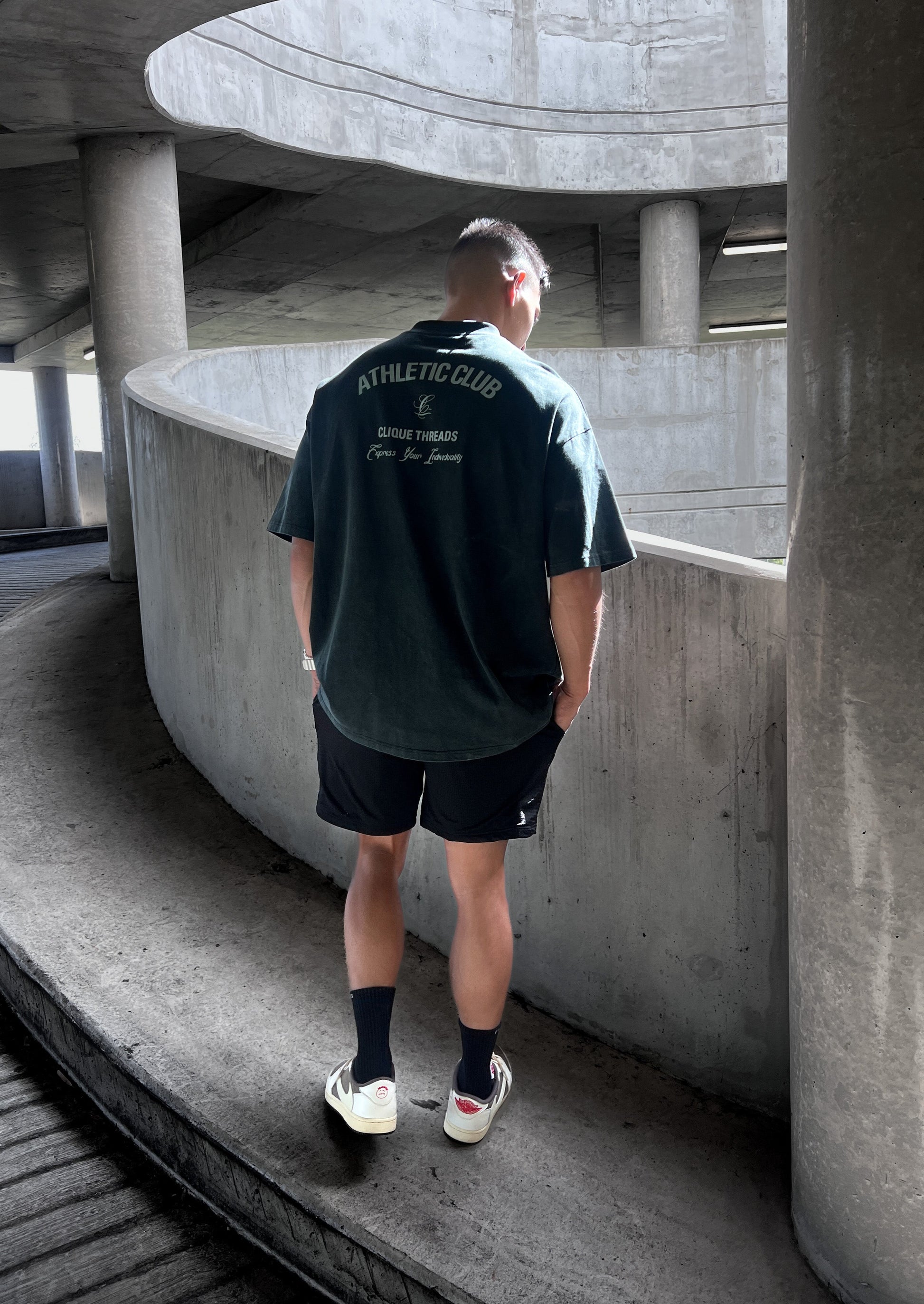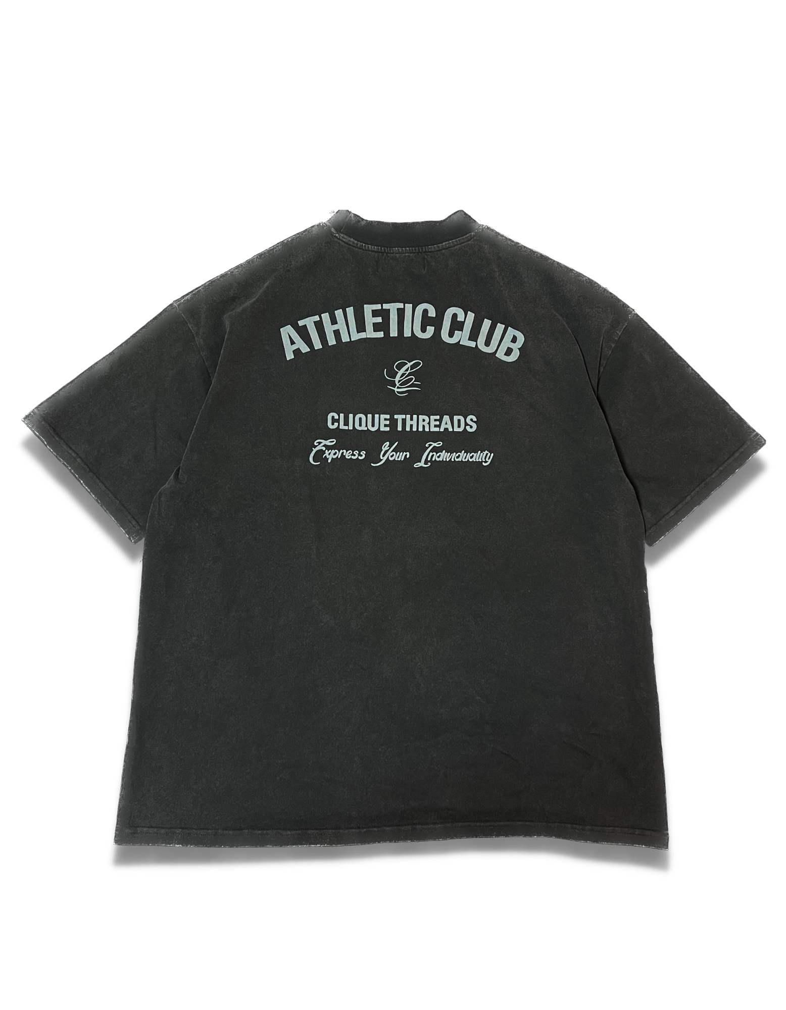This tee is created to be a boxy silhouette that is cut from a 300gsm jersey cotton that holds a beautiful drape along any body. This shirt features a direct to garment print "Athletic Club" logo on the back. Garment dyed for a soft to touch washed black fabric.