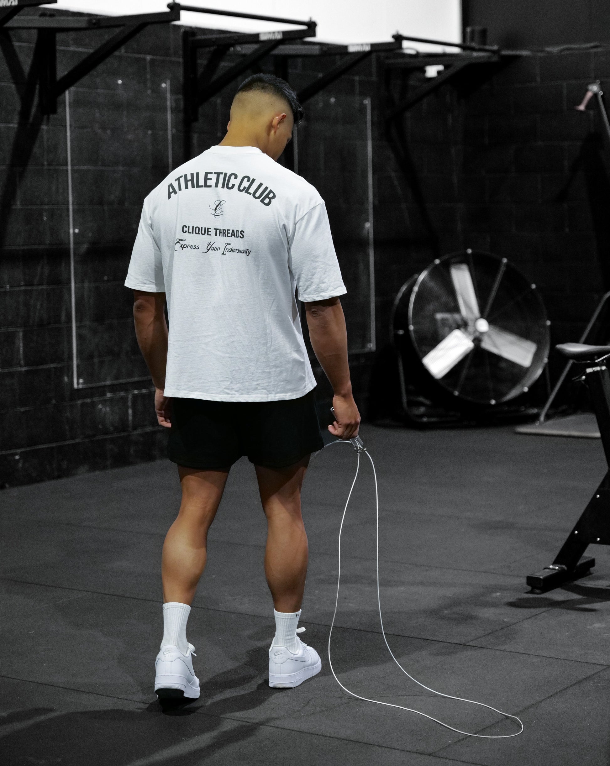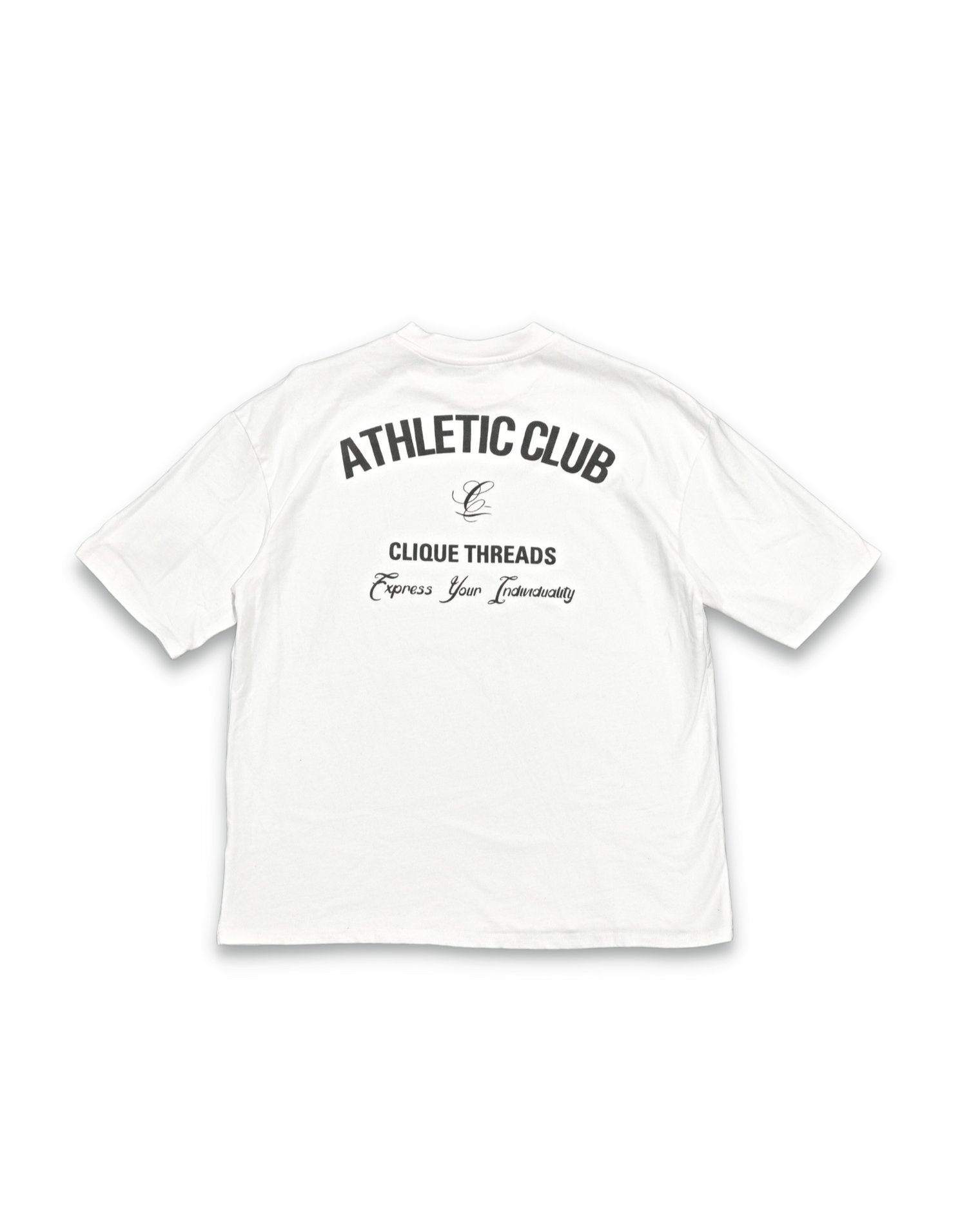 This tee is created to be a boxy silhouette that is cut from a 230gsm brushed cotton that holds a beautiful drape along any body. This shirt features a direct to garment print "Athletic Club" logo on the back.